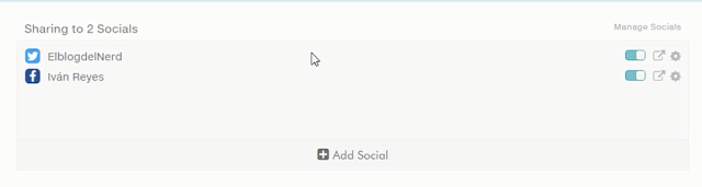 Y listo, ya tenemos nuestras dos cuentas de redes sociales para configurar y comenzar a automatizar la publicación de nuestras entradas. Pulsamos sobre el engrane que aparece sobre la misma linea del nombre para configurar: